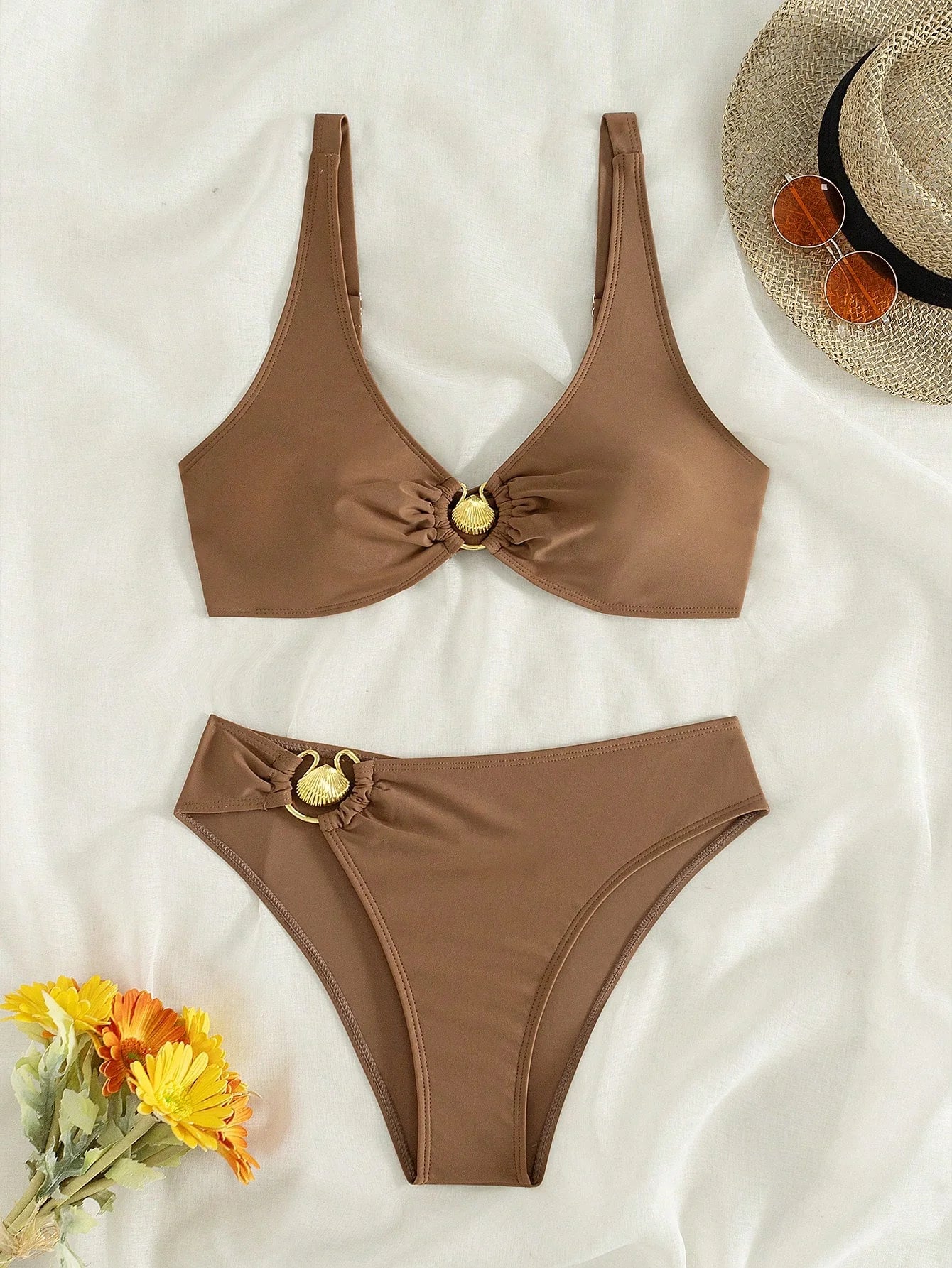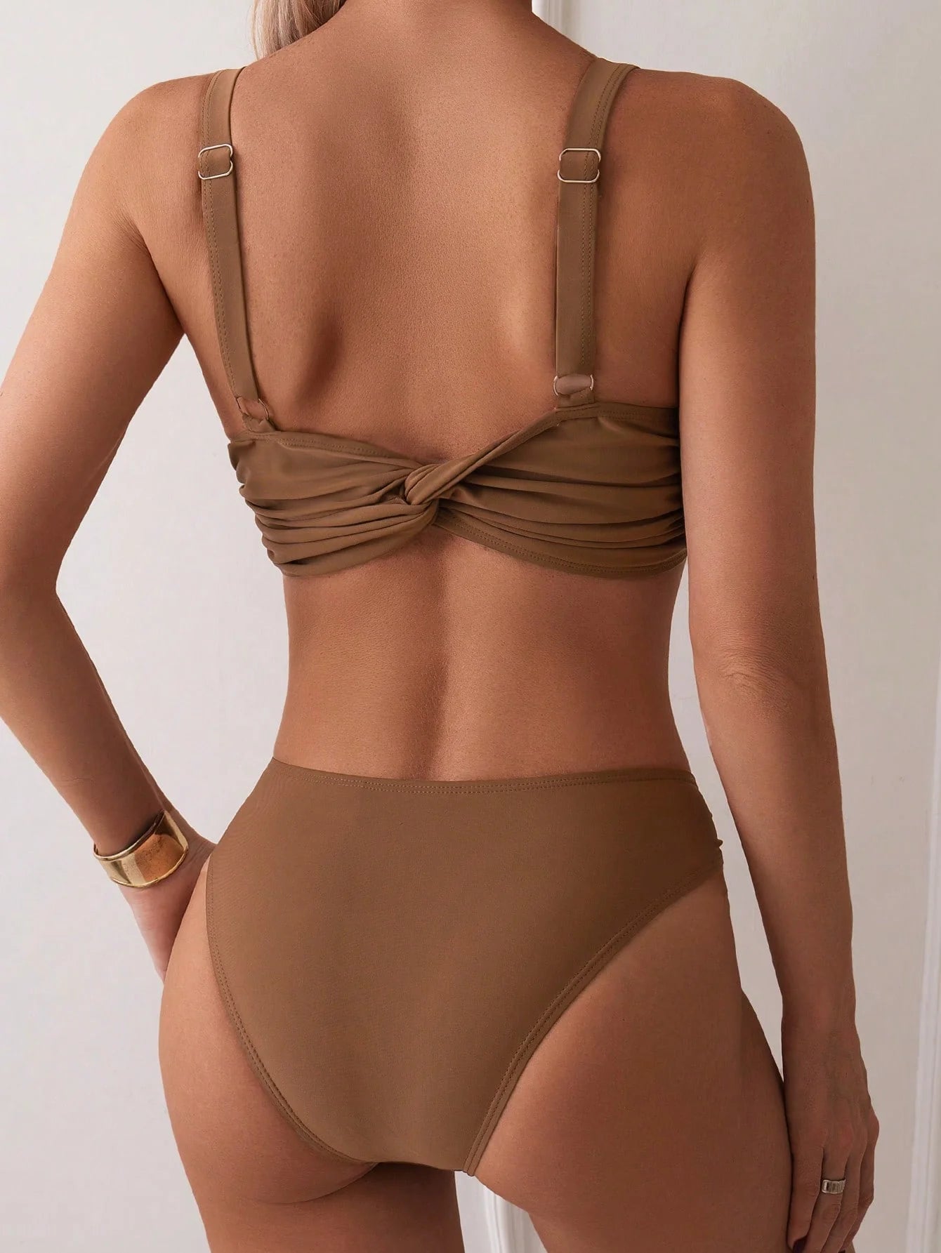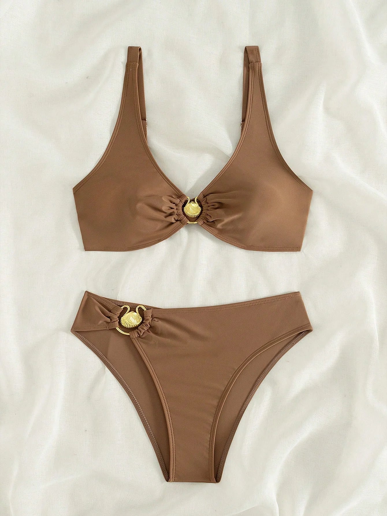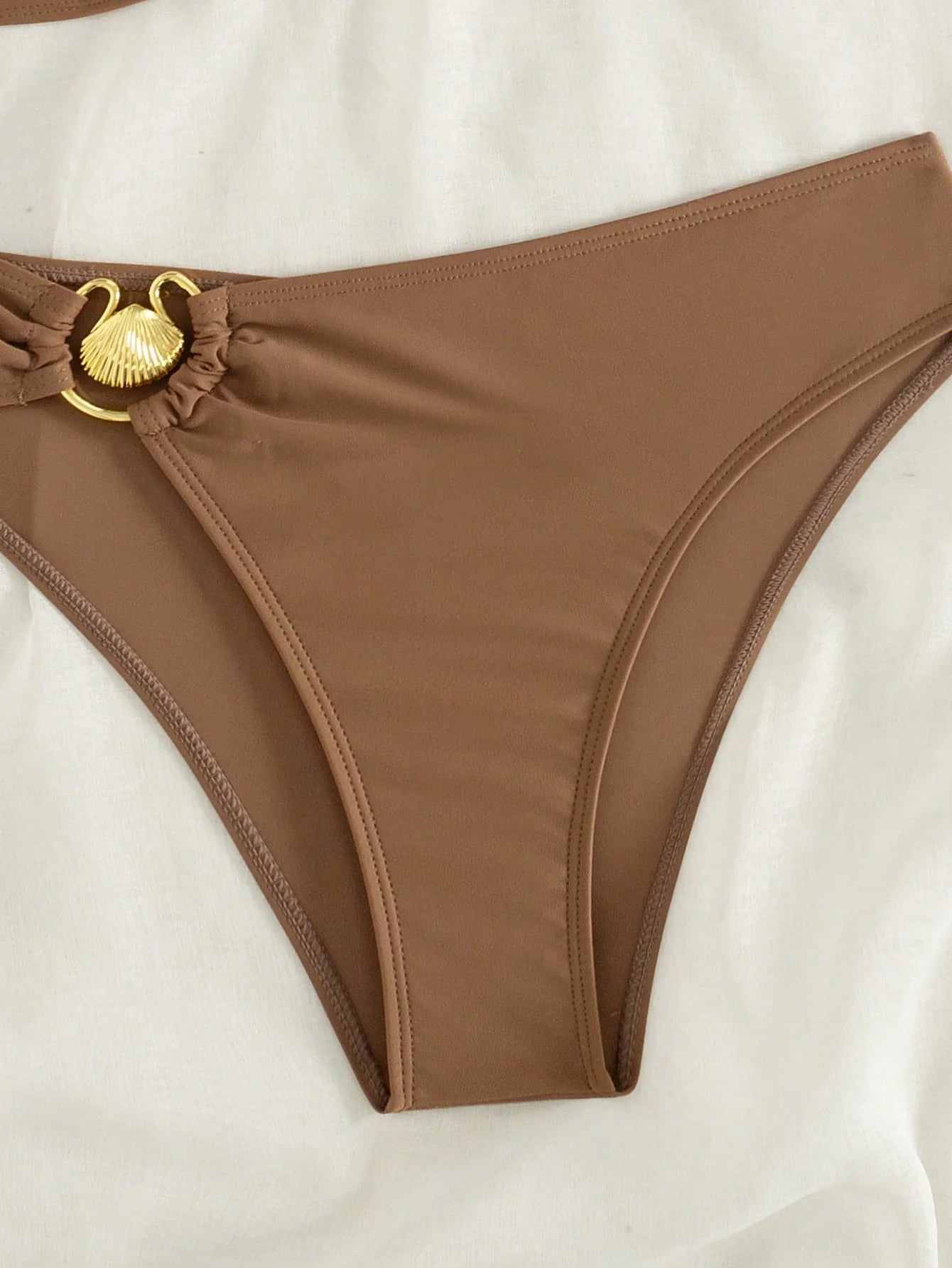 ✅ Biquíni Elegante café com estampa em bloco de cores e detalhes simples