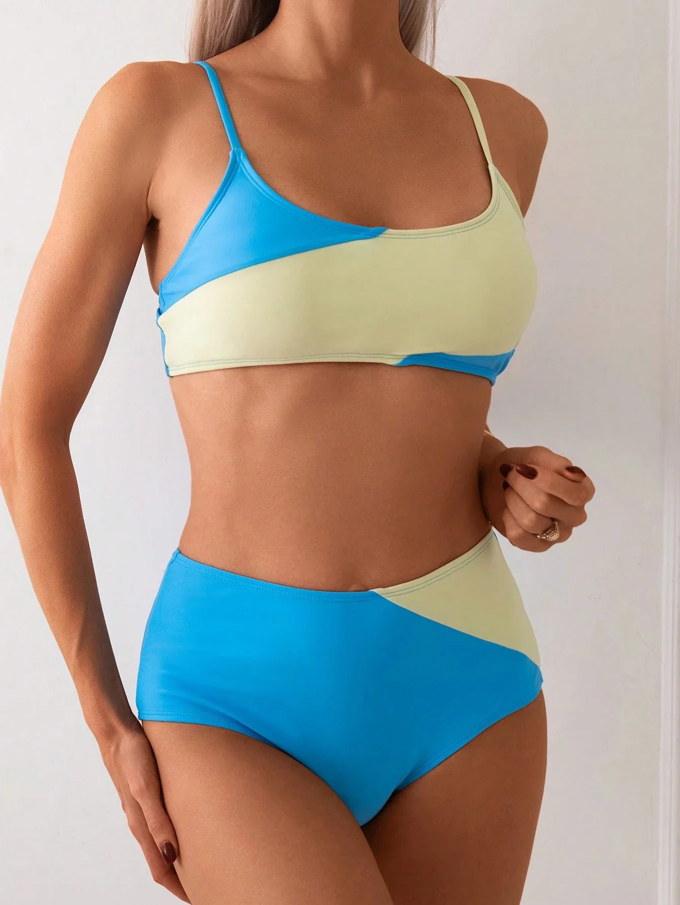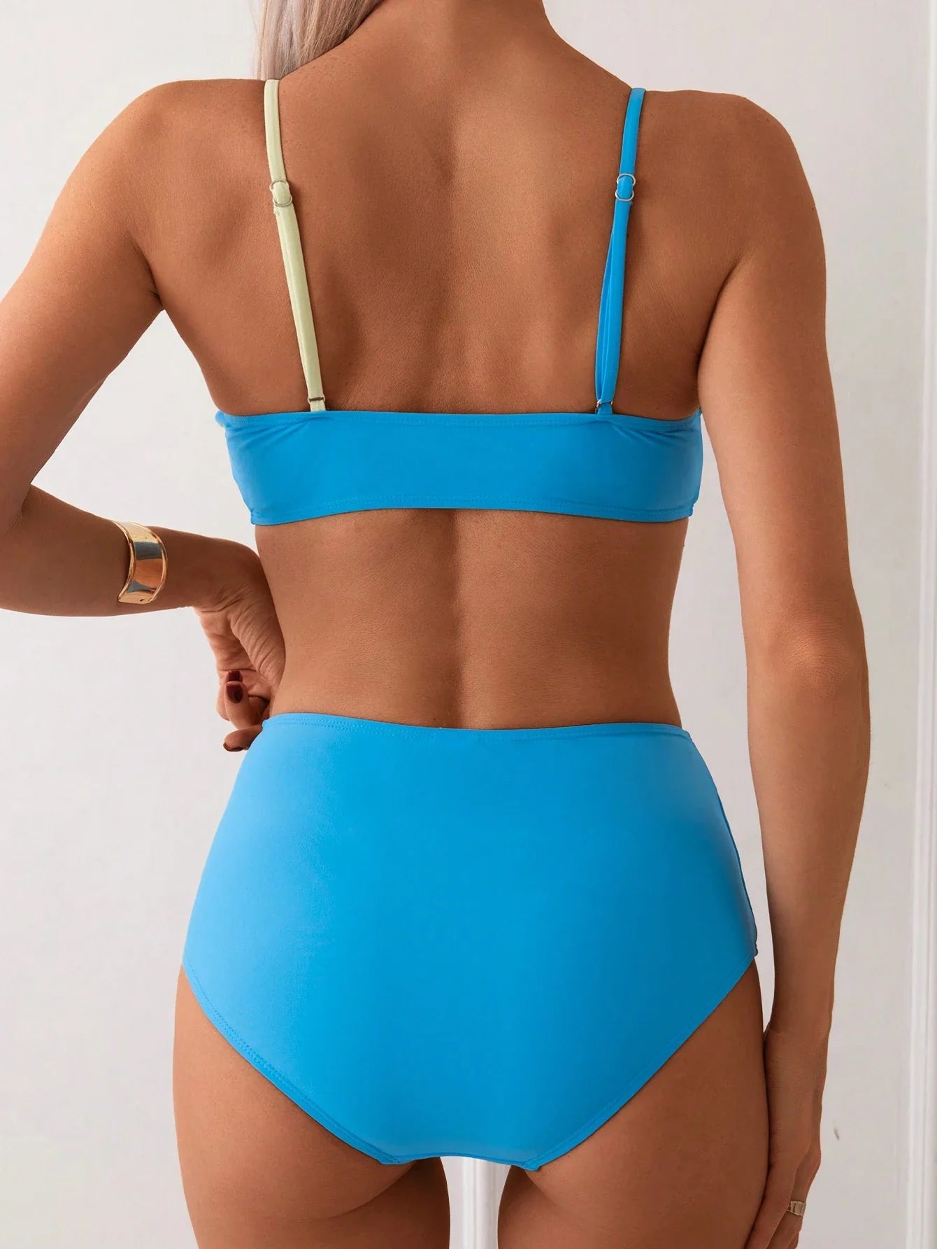 ✅ Biquíni casual azul e branco com estampa listrada e em bloco de cores