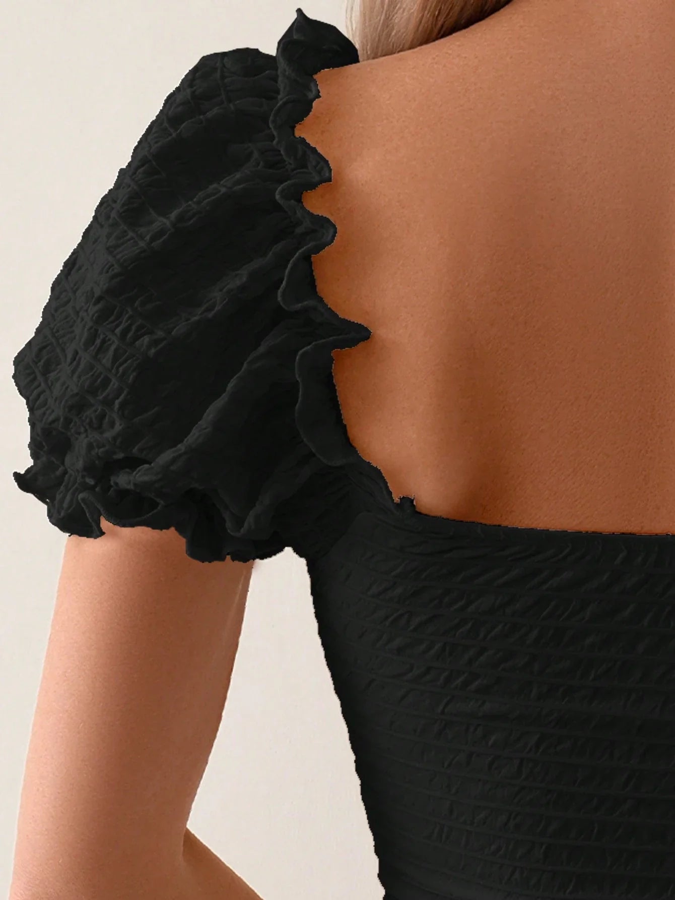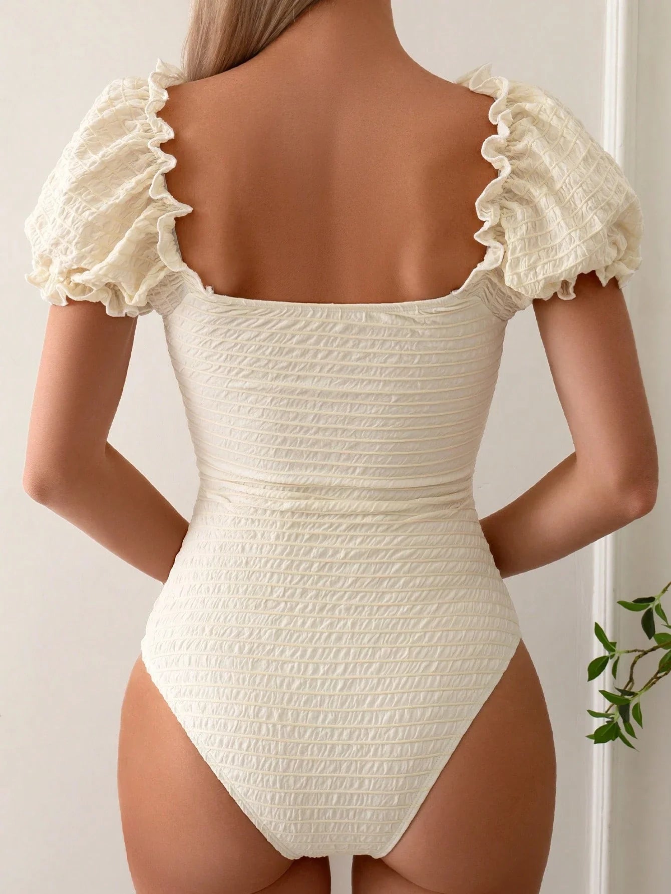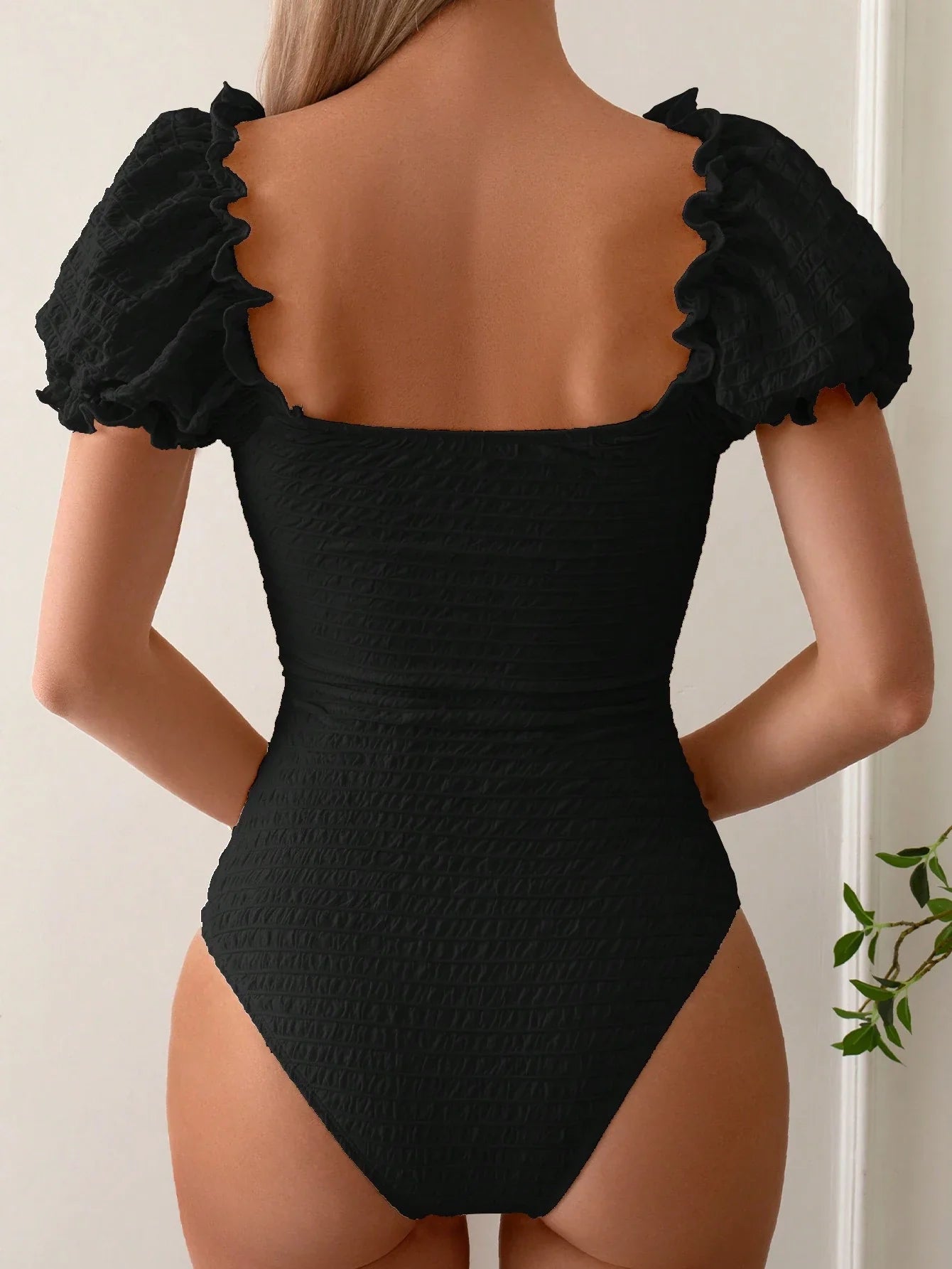 ✅ Decote U com detalhe vazado, anel decorativo e plissado moderno