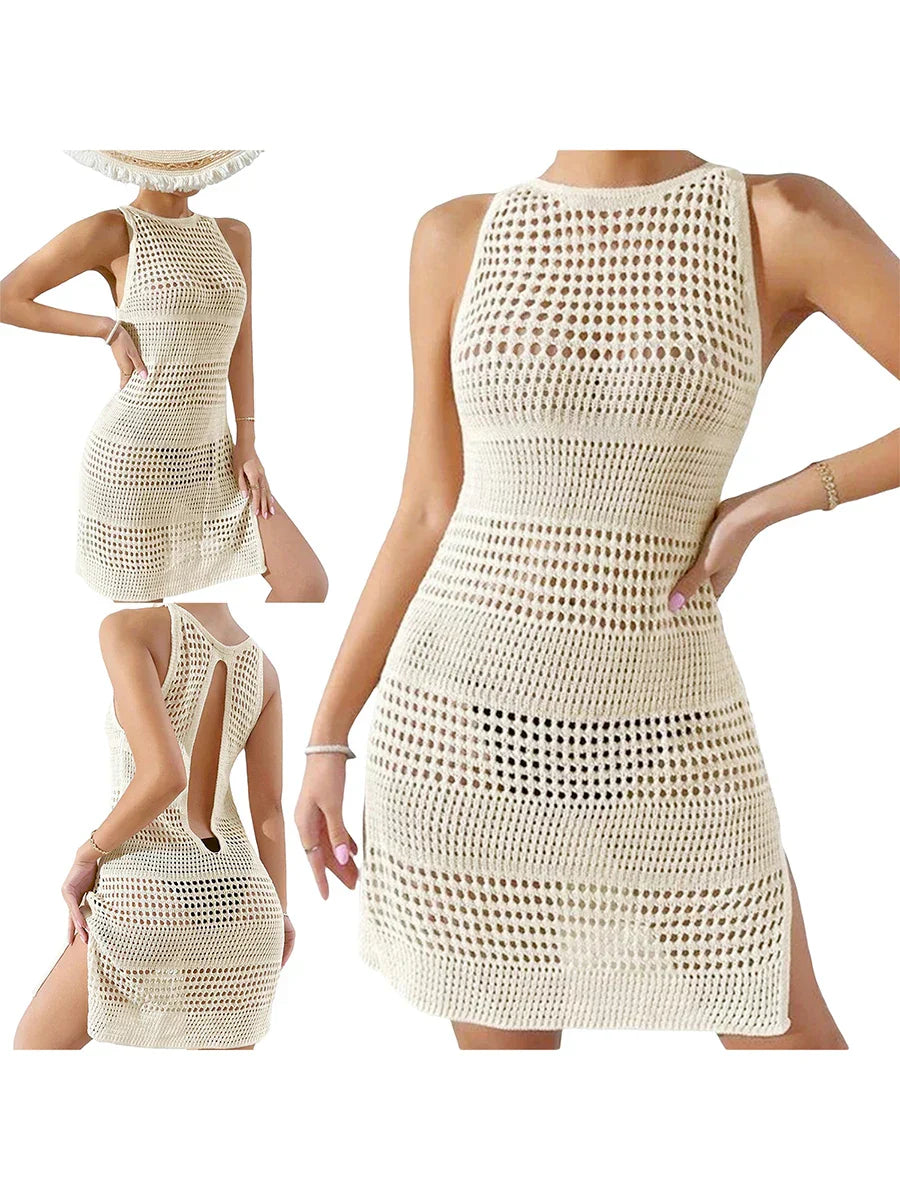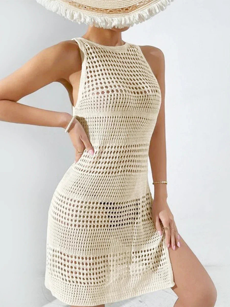 A Saída de Praia Elodie possui um estilo sem mangas, com gola redonda e design vazado, sendo ideal para sobreposição de biquínis e maiôs, oferecendo um toque de elegância e sensualidade.